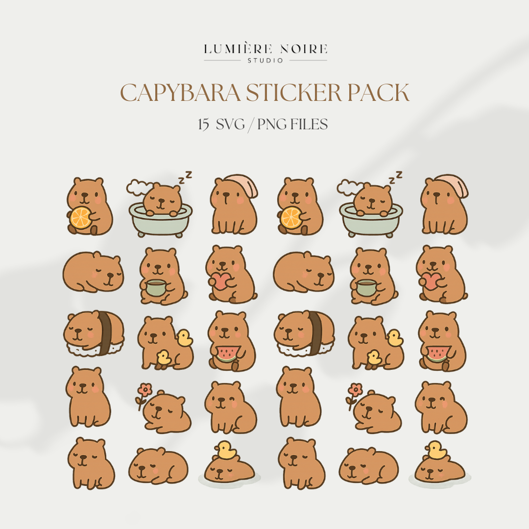 Capybara SVG & PNG Sticker Set – 15 Minimalist Vector Illustrations | Cute Animal Clipart | Kawaii Capybara Bundle | Digital Download