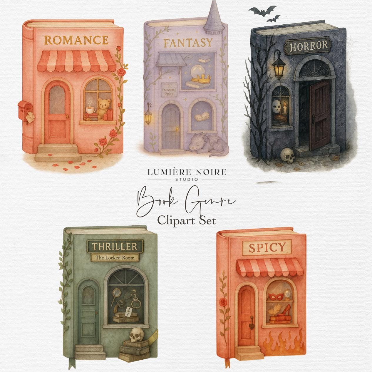 This Book Genre Clipart Set includes 5 detailed watercolor book covers – each styled to represent a literary genre with whimsical storefront charm. Whether you're a romance reader, a fantasy lover, or a horror fan, this set has a cozy corner for everyone.