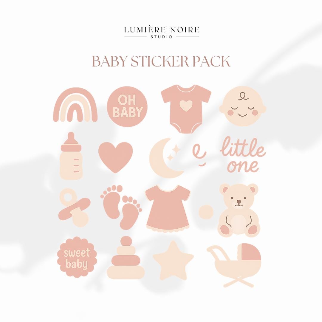 Add a soft and sweet touch to your content with this adorable collection of 17 baby-themed digital stickers in gentle shades of pink, beige, and white.