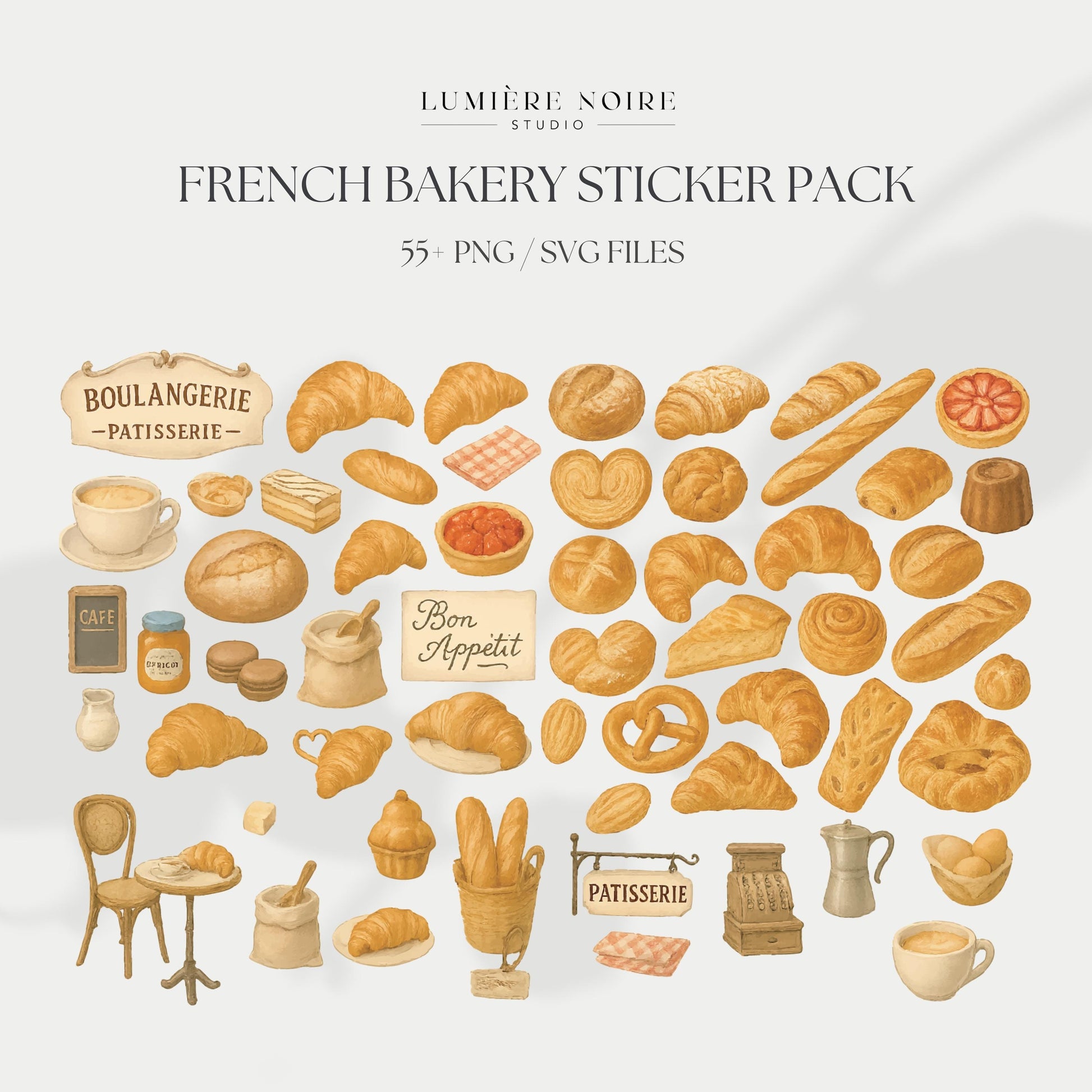 French Bakery Sticker Set | 60+ Realistic PNG & SVG Illustrations | Croissants, Pastries & Café Icons | Digital Download