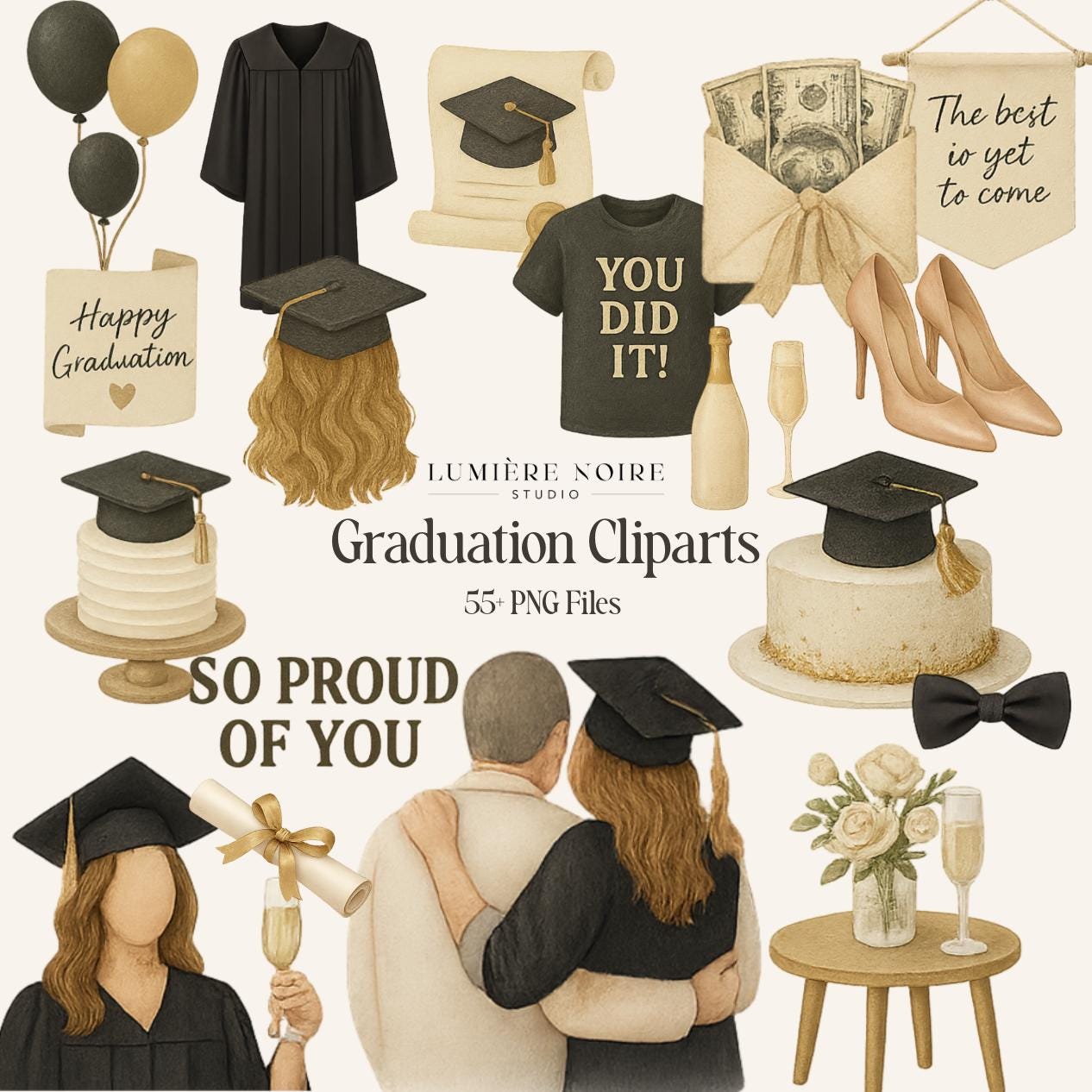Graduation Celebration Clipart Pack - 55 PNG Files | Elegant Designs with Resell Rights