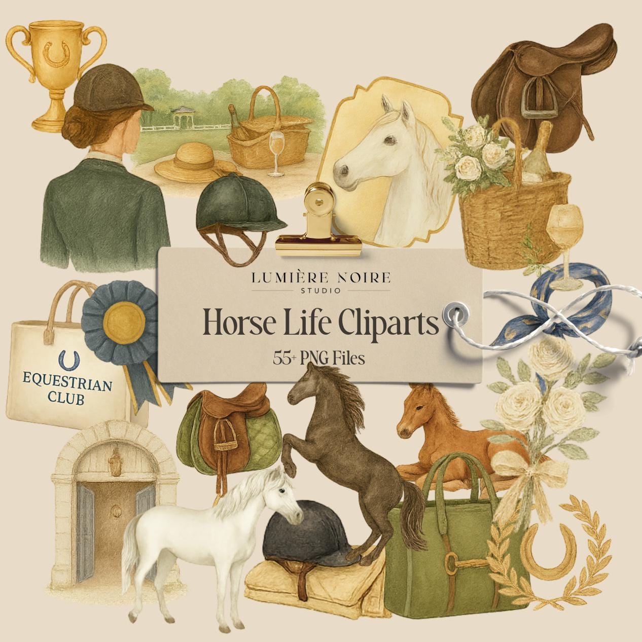 Horse Life Cliparts | 55+ PNG Files | Equestrian Aesthetic Watercolor Set | Digital Download with Master Resell Rights