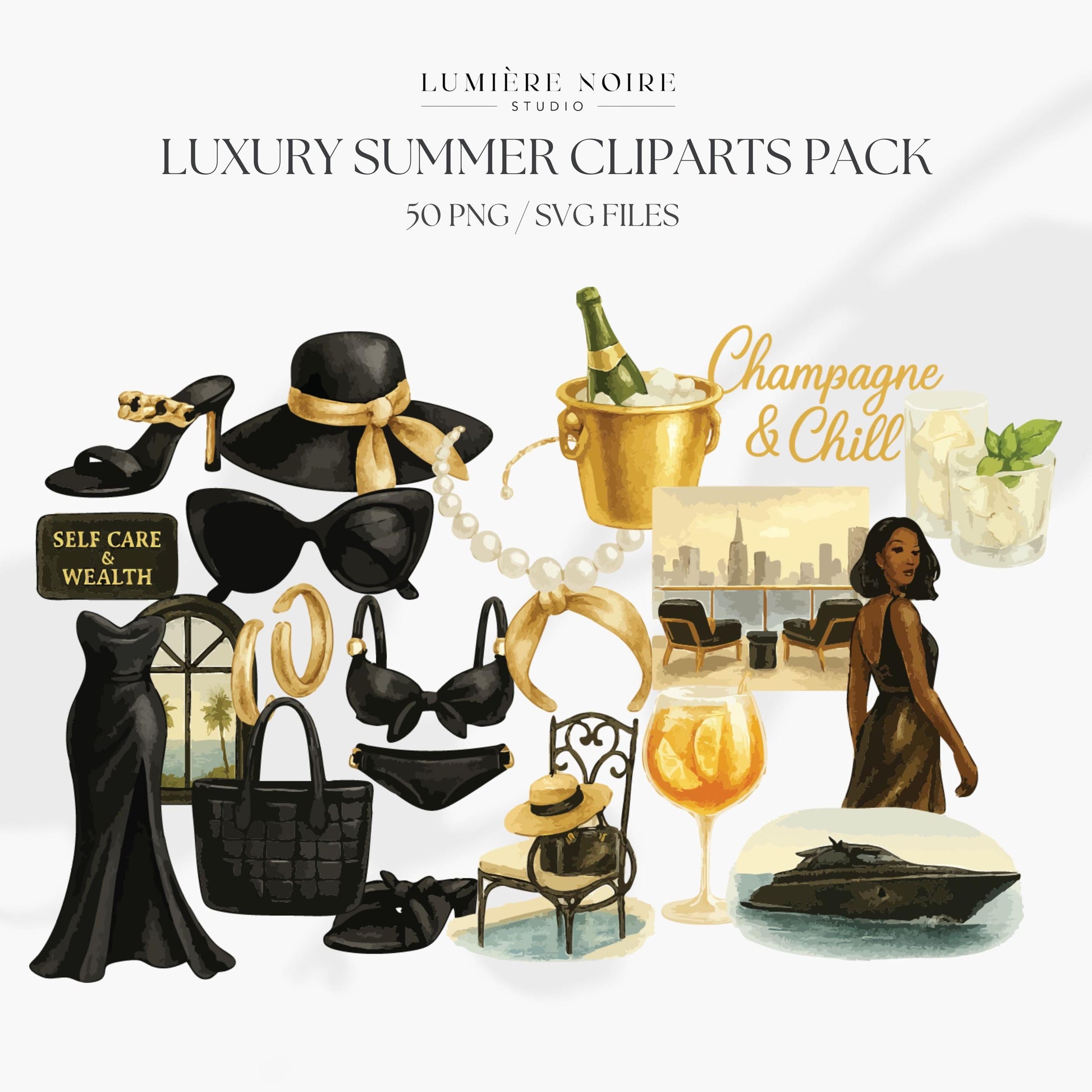 Step into a world of elegance and empowerment with the Luxury Summer Cliparts Pack – Black & Gold Edition. This exclusive set includes 50 high-end illustrations in rich, luxurious tones of black, gold, and warm neutrals – designed to elevate your digital projects with a bold and feminine summer vibe.