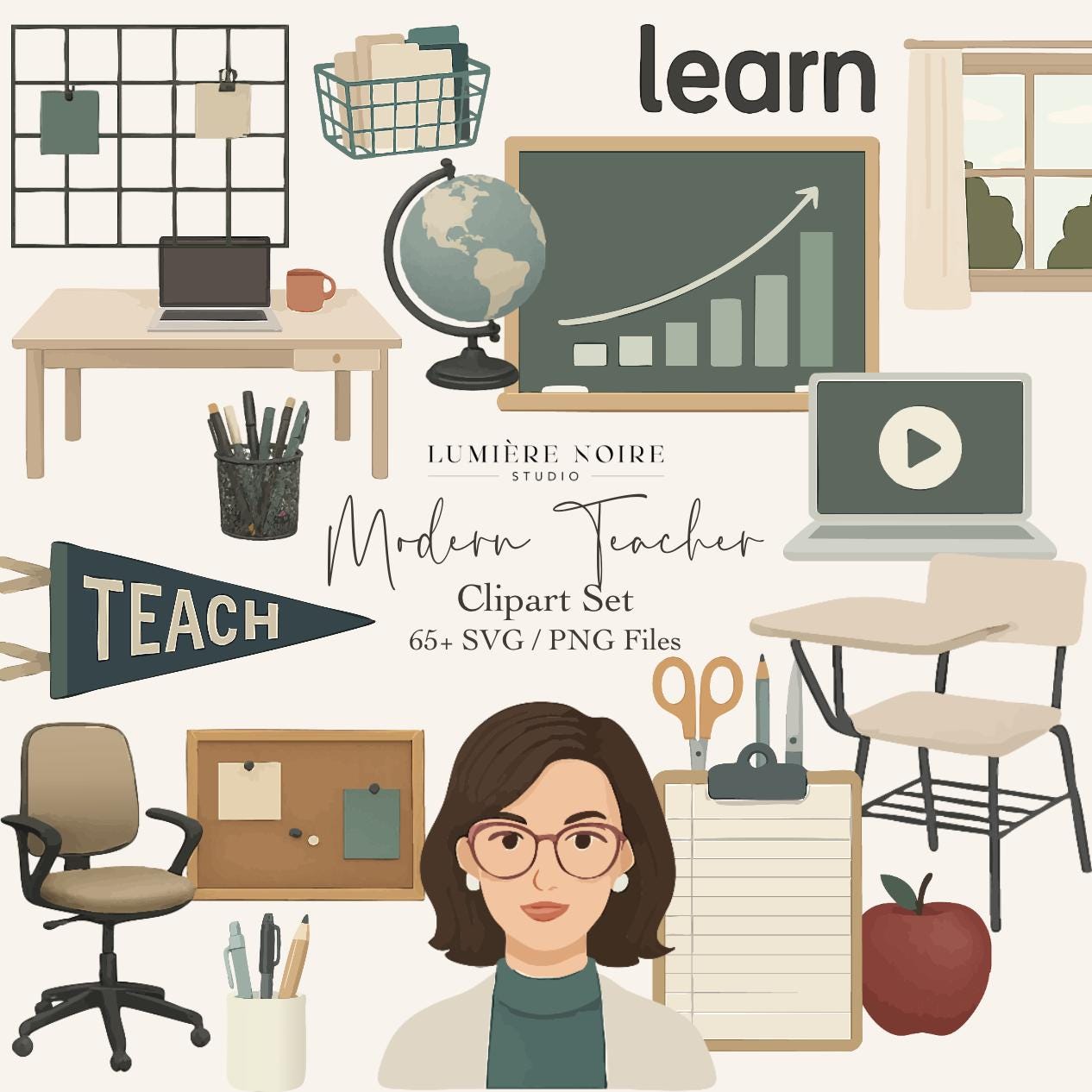 Modern Teacher Clipart Set | 65+ PNG & SVG Files | Classroom and Teacher Essentials | Digital Download with Master Resell Rights
