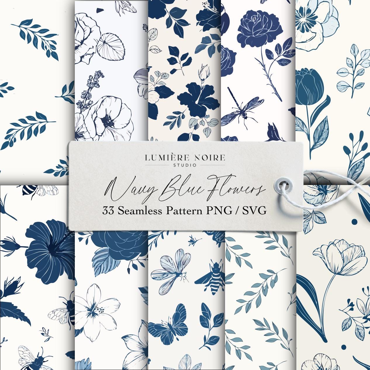 Navy Blue Floral Seamless Patterns – Botanical Line Art PNG SVG Bundle Digital Download with Master Resell Rights