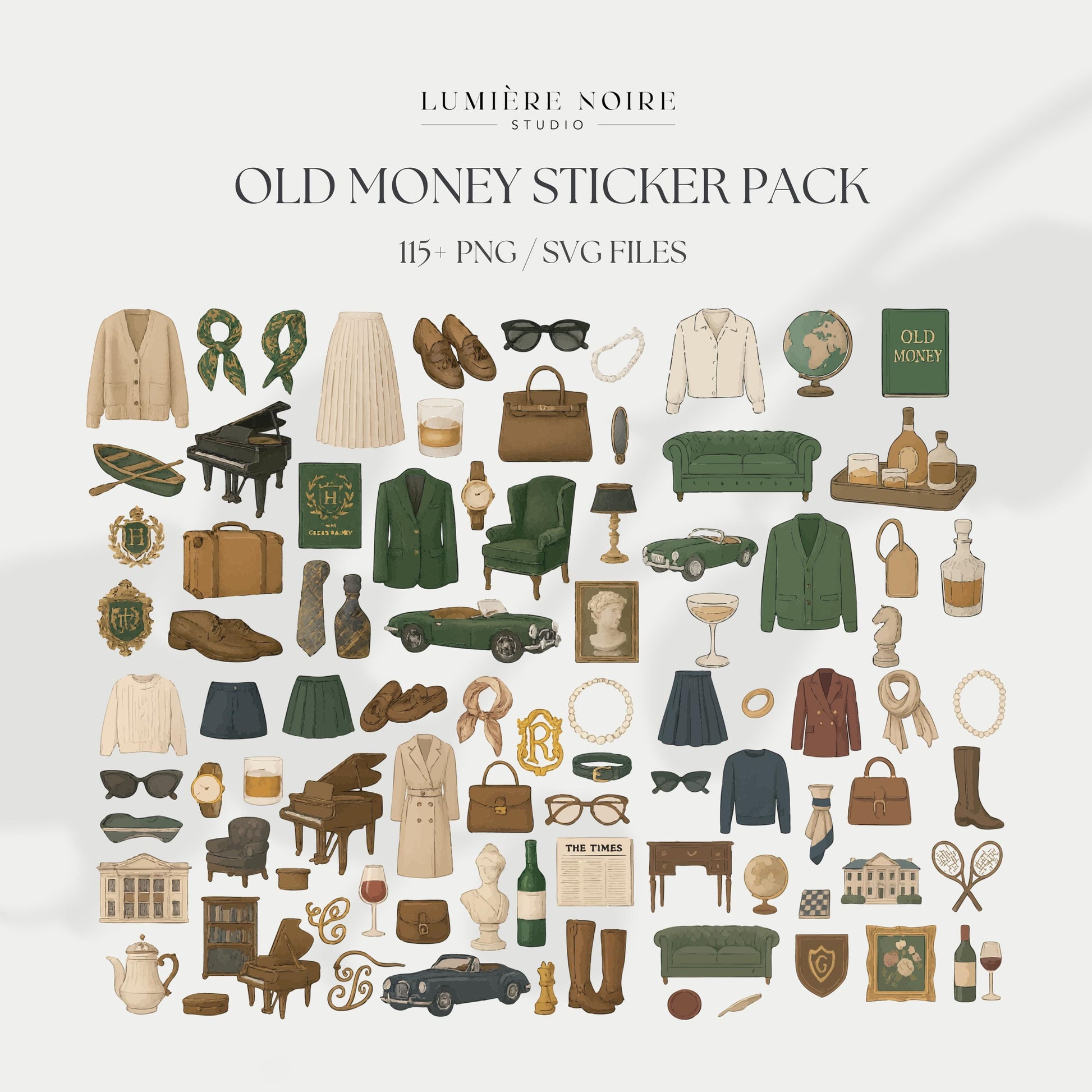 Old Money Aesthetic Sticker Bundle | 115+ Elegant PNG & SVG Cliparts | Quiet Luxury Digital Stickers with Master Resell Rights