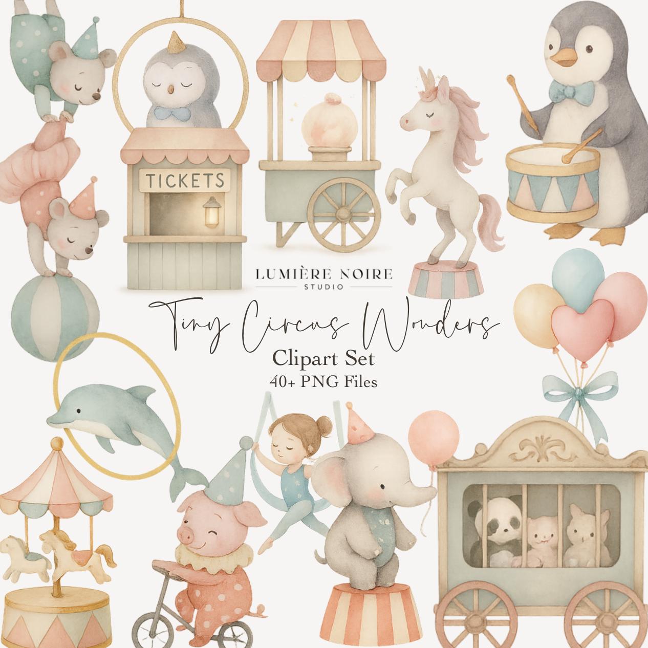 Tiny Circus Wonders Clipart – 40+ Pastel Circus Animals & Carnival PNGs – Baby Shower, Kids Birthday, Nursery Art, Scrapbooking, Sublimation