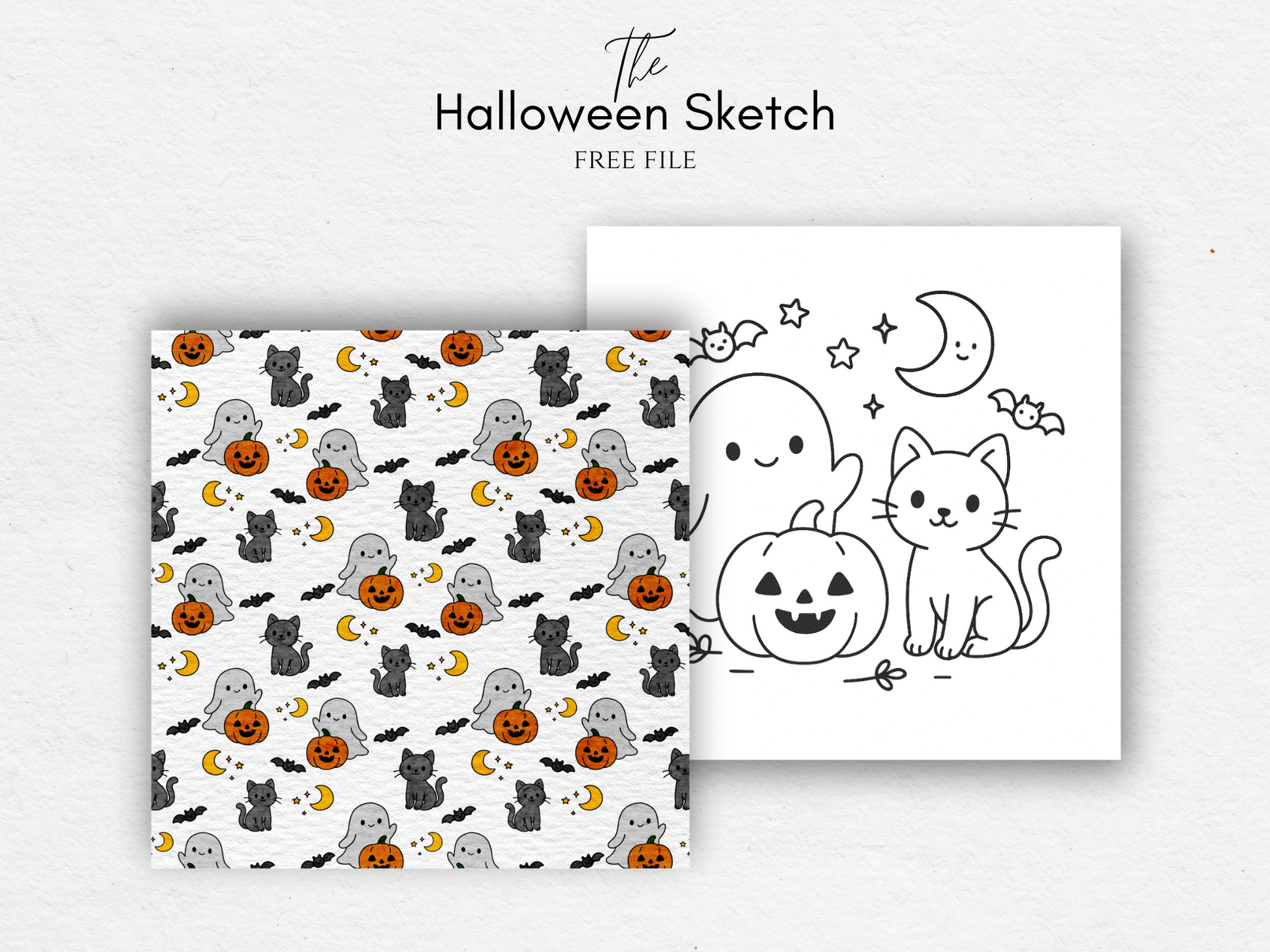 Free Halloween coloring page with cute ghost, cat, pumpkin & moon! Perfect printable line art for kids & Procreate sketch practice.